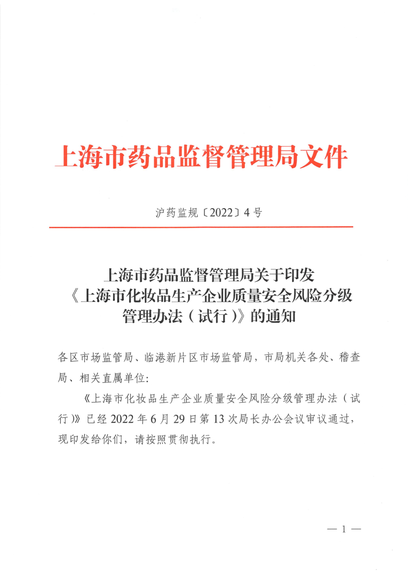 《上海市化妆品生产企业质量安全风险分级管理办法(试行)》已经2022年6月29日第13次局长办公会议审议通过,现印发给你们,请按照贯彻执行。