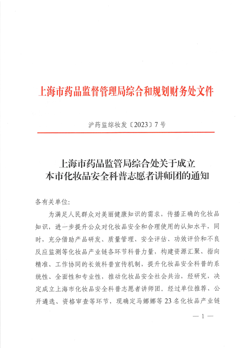 为满足人民群众对美丽健康知识的需求,传播正确的化妆品知识,进一步提升公众对化妆品安全和合理使用的认知水平,同时,充分借助产品研发、质量管理、安全评估、功效评价和不良反应监测等化妆品产业链各环节科普力量,构建资源汇聚、指向精准、工作协同的长效科普宣传机制,提升化妆品安全科普的系统性、全面性和专业性,推动化妆品安全社会共治,经研究,决定成立上海市化妆品安全科普志愿者讲师团。经过单位推荐、公开遴选、资格审查等环节,现确定马娜娜等23名化妆品产业链各环节工作者为讲师团首批成员。