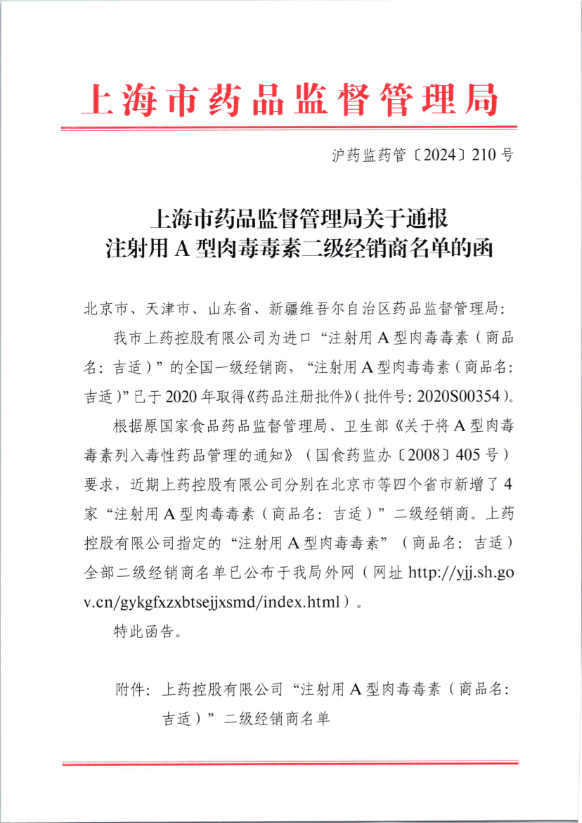 根据原国家食品药品监督管理局、卫生部《关于将A型肉毒毒素列入毒性药品管理的通知》(国食药监办〔2008〕405号)要求,近期上药控股有限公司分别在北京市等四个省市新增了4家“注射用A型肉毒毒素(商品名:吉适)”二级经销商。上药控股有限公司指定的“注射用A型肉毒毒素”(商品名:吉适)全部二级经销商名单已公布于我局外网(网址http://m.askai.vip/gykgfxzxbtsejjxsmd/index.html)。