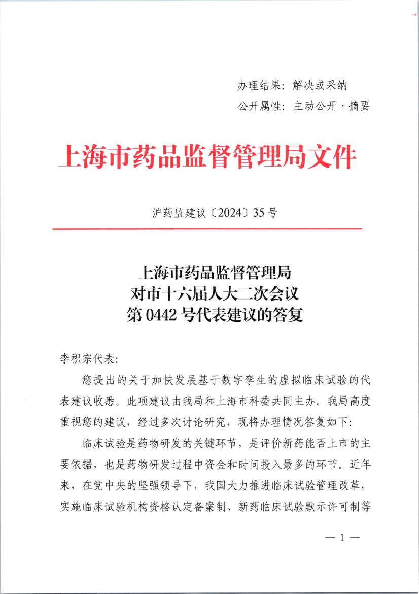 您提出的关于加快发展基于数字孪生的虚拟临床试验的代表建议收悉。此项建议由我局和上海市科委共同主办。我局高度重视您的建议,经过多次讨论研究,现将办理情况答复如下: