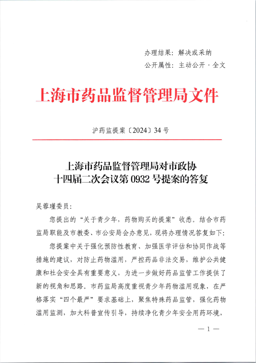 您提出的“关于青少年,药物购买的提案”收悉。结合AG真人职能及市教委、市公安局会办意见,现将办理情况答复如下: