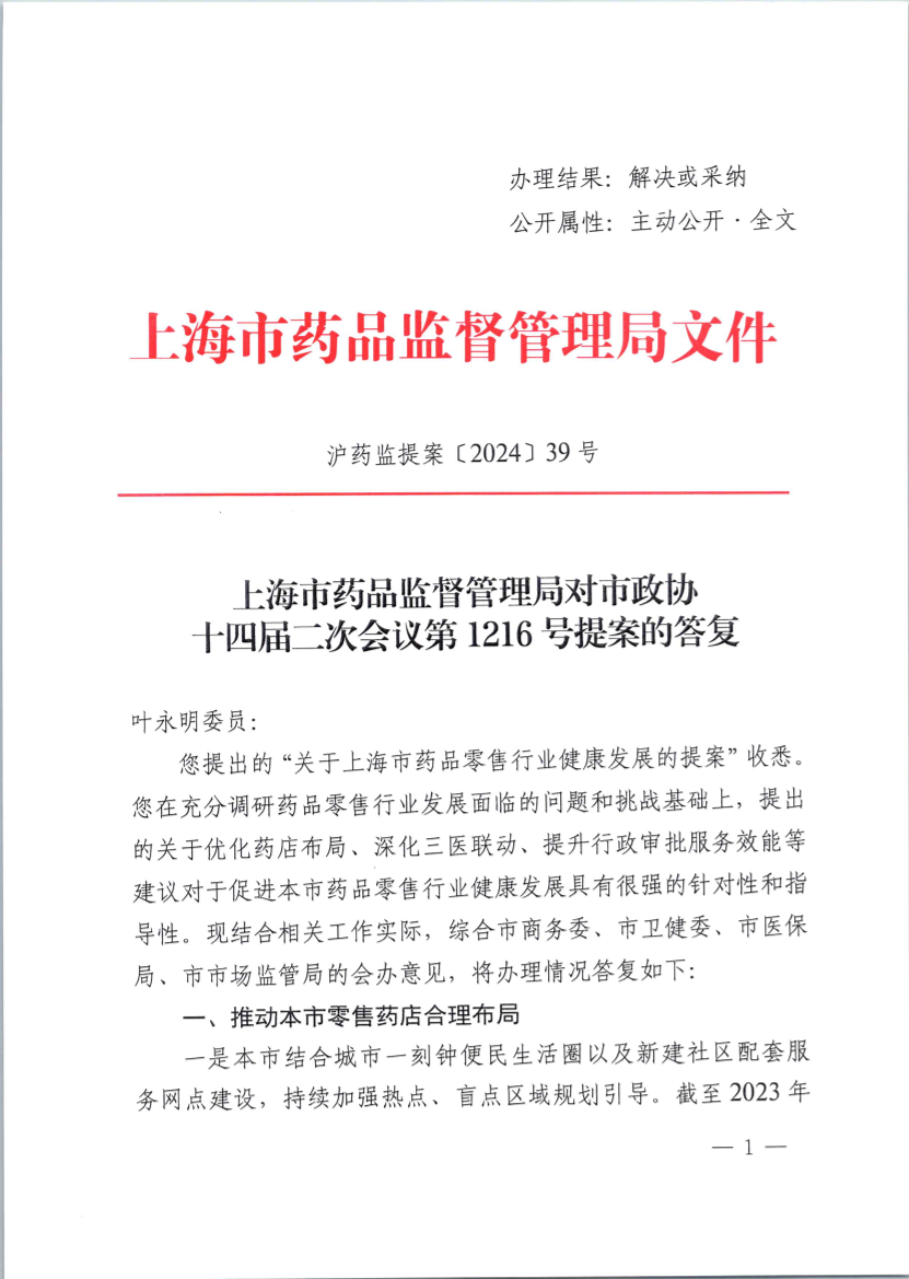 您提出的“关于上海市药品零售行业健康发展的提案”收悉。您在充分调研药品零售行业发展面临的问题和挑战基础上,提出的关于优化药店布局、深化三医联动、提升行政审批服务效能等建议对于促进本市药品零售行业健康发展具有很强的针对性和指导性。现结合相关工作实际,综合市商务委、市卫健委、市医保局、市市场监管局的会办意见,将办理情况答复如下:
