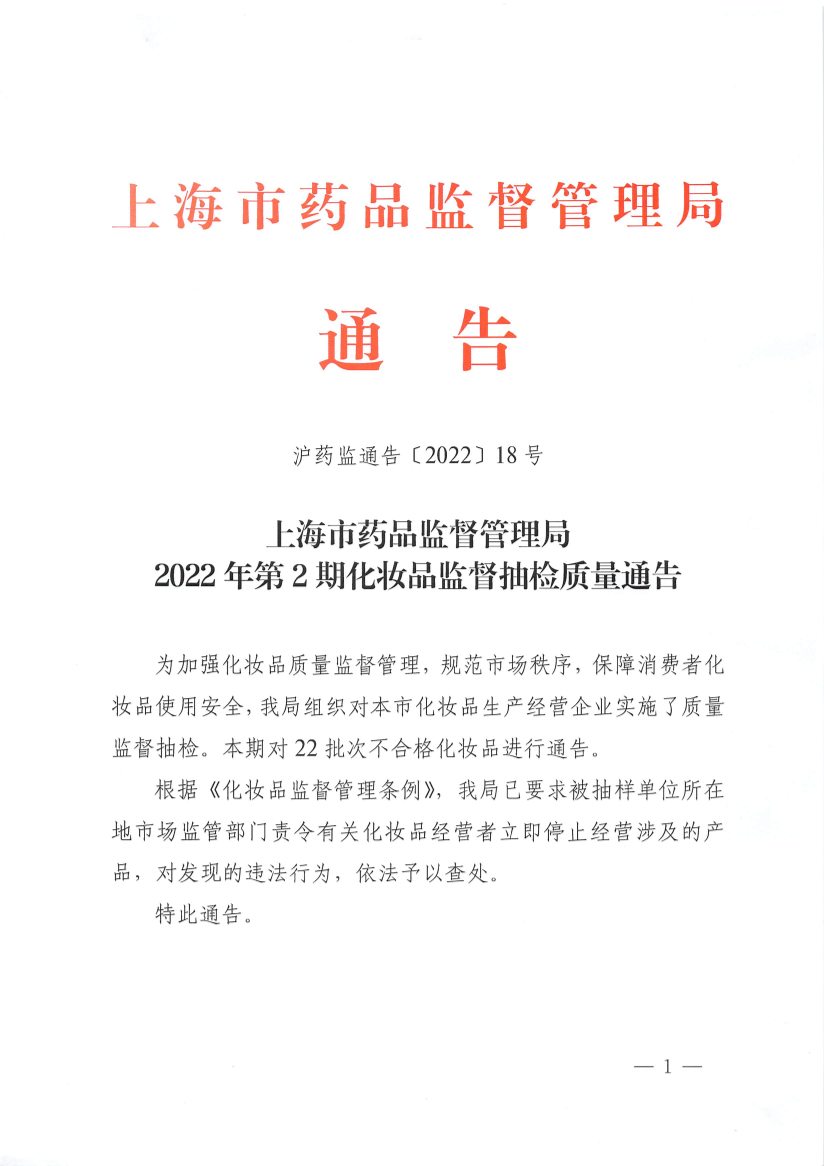 为加强化妆品质量监督管理,规范市场秩序,保障消费者化妆品使用安全,我局组织对本市化妆品生产经营企业实施了质量监督抽检。本期对22批次不合格化妆品进行通告。