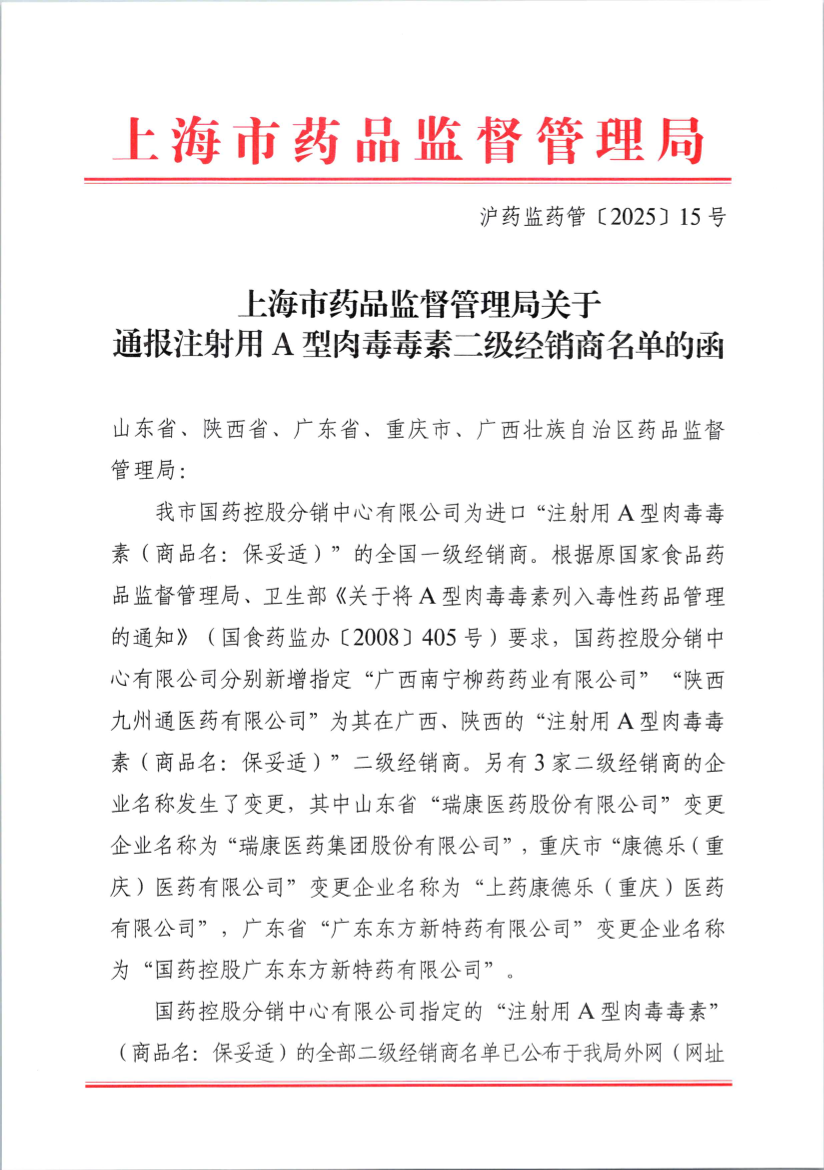 我市国药控股分销中心有限公司为进口“注射用A型肉毒毒素(商品名:保妥适)”的全国一级经销商。根据原国家食品药品监督管理局、卫生部《关于将A型肉毒毒素列入毒性药品管理的通知》(国食药监办〔2008〕405号)要求,国药控股分销中心有限公司分别新增指定“广西南宁柳药药业有限公司”“陕西九州通医药有限公司”为其在广西、陕西的“注射用A型肉毒毒素(商品名:保妥适)”二级经销商。另有3家二级经销商的企业名称发生了变更,其中山东省“瑞康医药股份有限公司”变更企业名称为“瑞康医药集团股份有限公司”,重庆市“康德乐(重庆)医药有限公司”变更企业名称为“上药康德乐(重庆)医药有限公司”,广东省“广东东方新特药有限公司”变更企业名称为“国药控股广东东方新特药有限公司”。