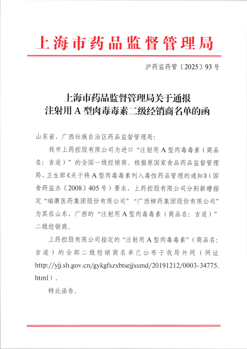 我市上药控股有限公司为进口“注射用A型肉毒毒素(商品名:吉适)”的全国一级经销商。根据原国家食品药品监督管理局、卫生部《关于将A型肉毒毒素列入毒性药品管理的通知》(国食药监办〔2008〕405号)要求,上药控股有限公司分别新增指定“瑞康医药集团股份有限公司”“广西柳药集团股份有限公司”为其在山东、广西的“注射用A型肉毒毒素(商品名:吉适)”二级经销商。